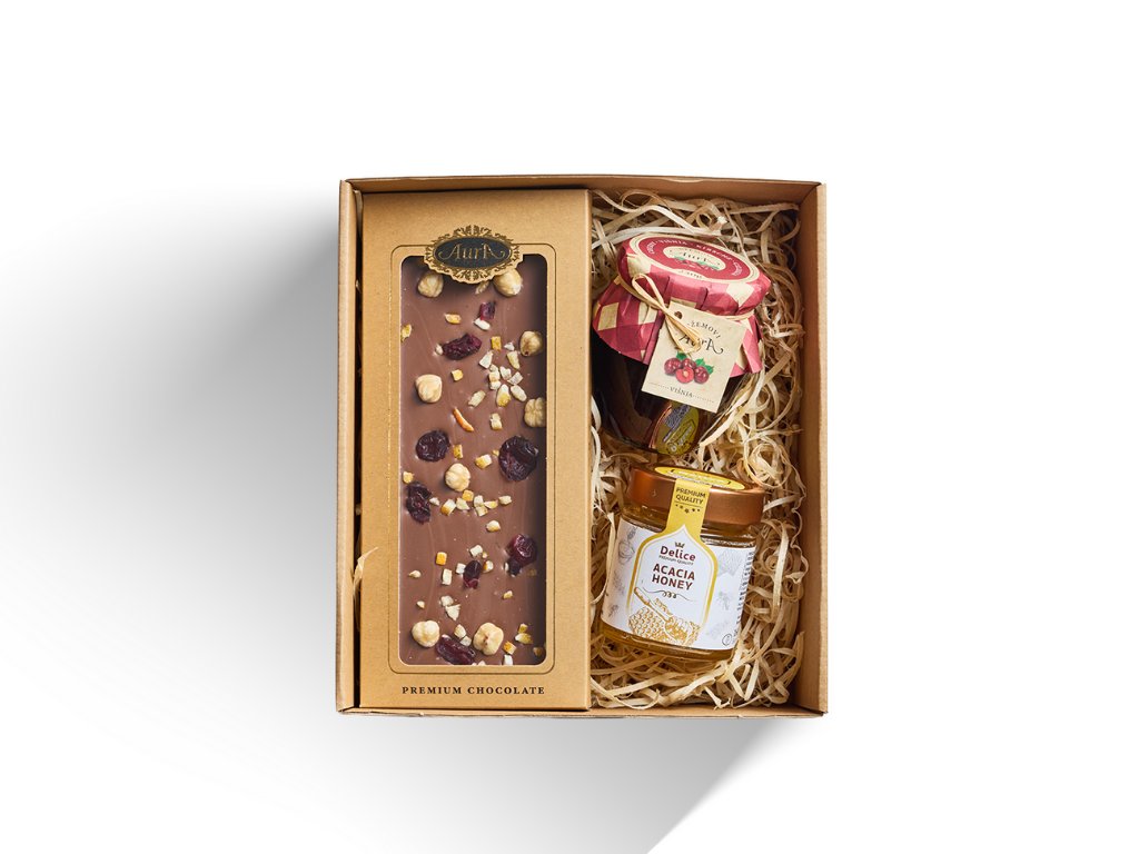 Aura Premium čokoláda • Džem • Akátový med Luxusní sladké potěšení v elegantním dárkovém balení.