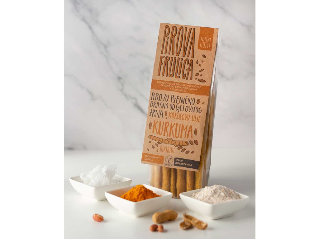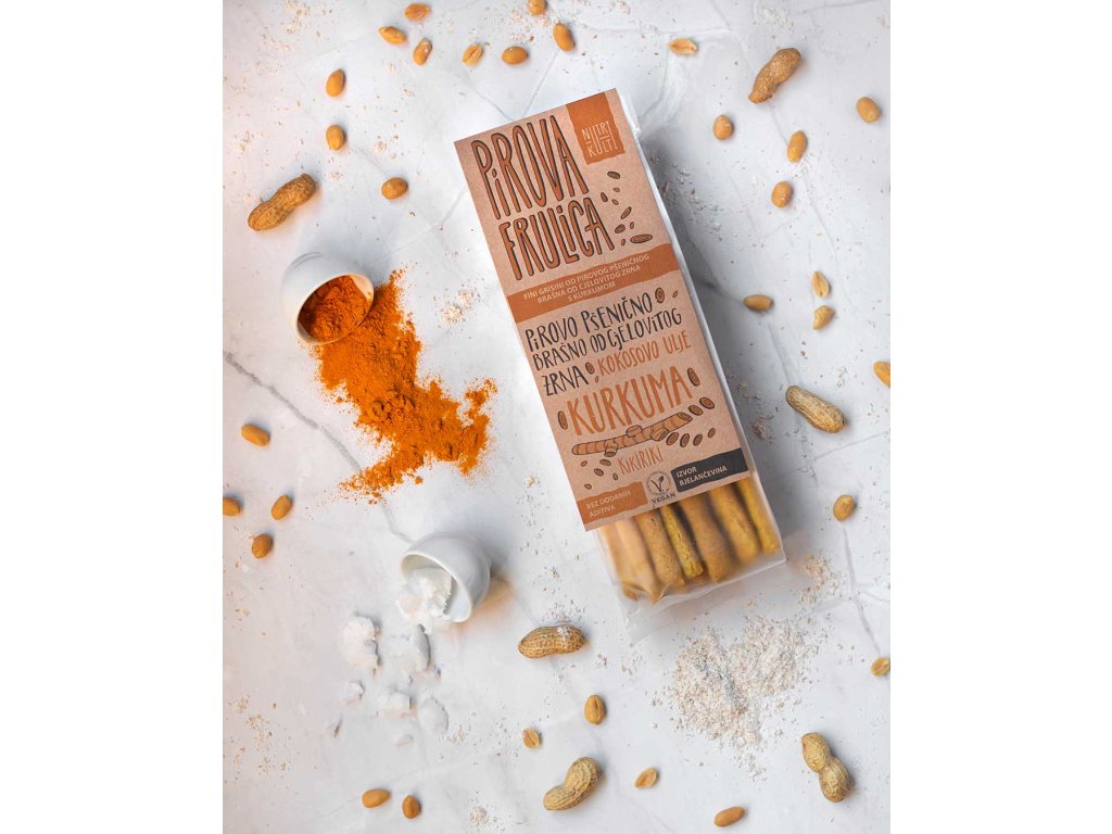 Složení: celozrnná špaldová mouka (původ: Chorvatsko) 65 %, arašídy 20 %, kokosový olej 8 %, voda, kurkuma 1 %, droždí, sůl. Může obsahovat stopy mandlí, lískových ořechů, sóji a sezamu.