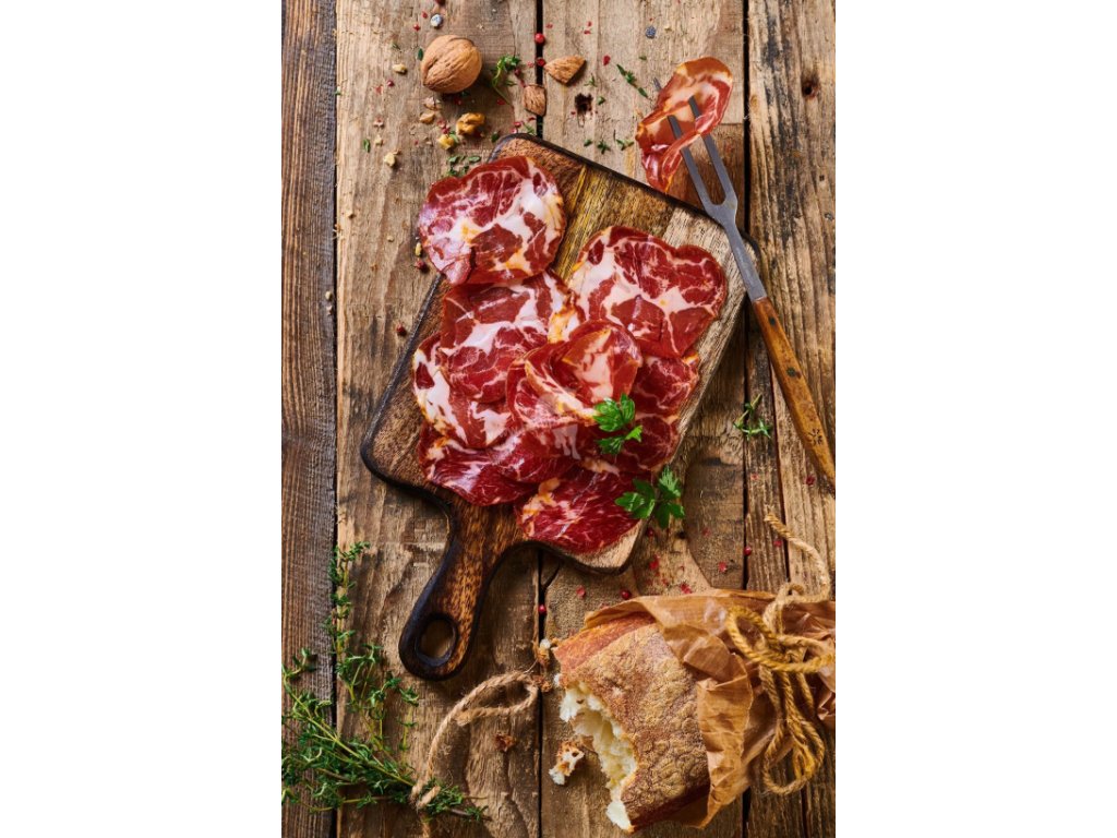 Španělská sušená vepřová krkovice pocházející z 50% z polodivokých iberských prasat krmených běžným krmením (tzv. cebo). Ideálně se hodí jako součást tapas společně se španělskými olivami a španělskými sýry.